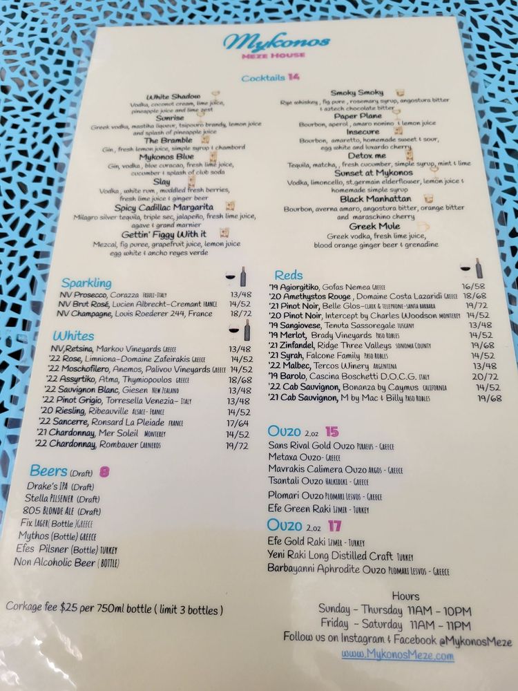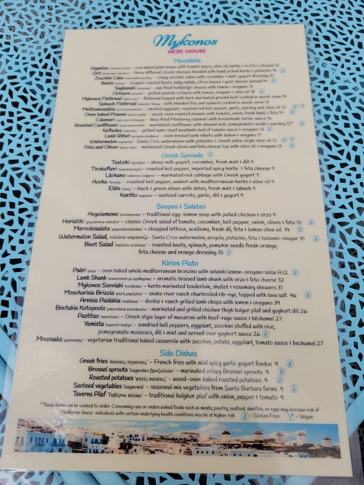 Welcome to Mykonos Meze, a tapas/small plates Greek bar located in Burlingame, CA. This upscale and trendy restaurant offers a variety of Greek spreads, including Acuka roasted bell pepper with walnut, Elies black & green olives with dates, and Tzatziki made with sheep milk yogurt. The menu also features soups and salads like the Avgolemono egglemon soup and the Horiatiki classic Greek salad. For those looking for a hearty meal, the Mezedakia section offers dishes like the Calamari and the Gigantes baked Greek beans.